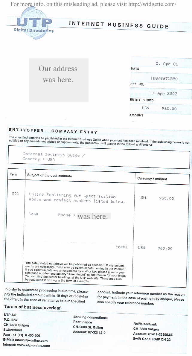 We must find a way to stop these people. I've had at least a dozen calls from customers that think the bill is coming from the ISP. It is NOT. UTP sends out these misleading invoices to businesses that have registered internet domain names.